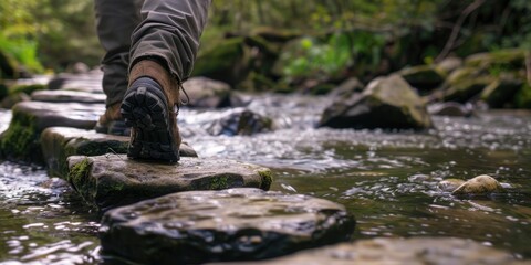 Smooth stepping stones guide through calm waters in a tranquil river surrounded by vibrant greenery and sunlight