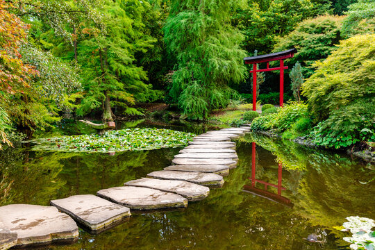 A tranquil scene featuring a path of stepping stones leading over a still body of water at dusk.