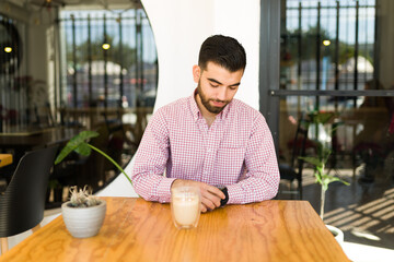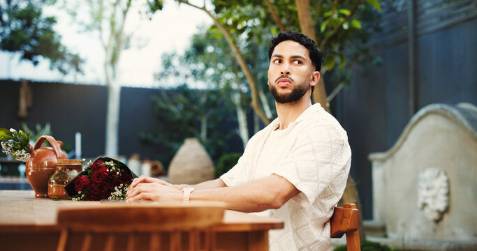 Thinking, waiting and man with flowers, date delay and contemplation with Valentines day. Home, bouquet and person with stress, stood up or wonder with reflection, frustrated or annoyed with concern