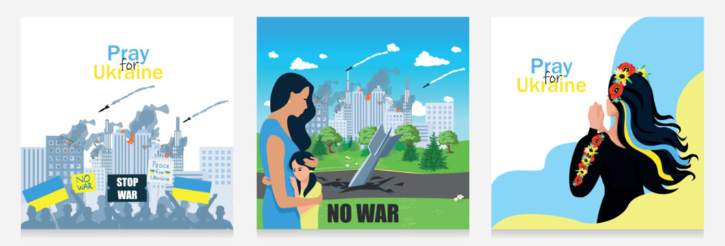 Protest against the war in Ukraine. A beautiful Ukrainian woman folded her hands in prayer. Mom hugs and protects her daughter against the backdrop of a ruined city on fire from bombs and shells. Set