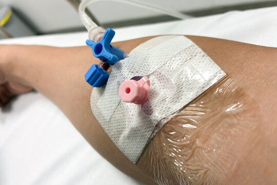 Close up view of a patient’s arm with a pink intravenous (IV) cannula and blue three way stopcock valve inserted for hospital treatment, fluid therapy, or medication administration in a clinical setti