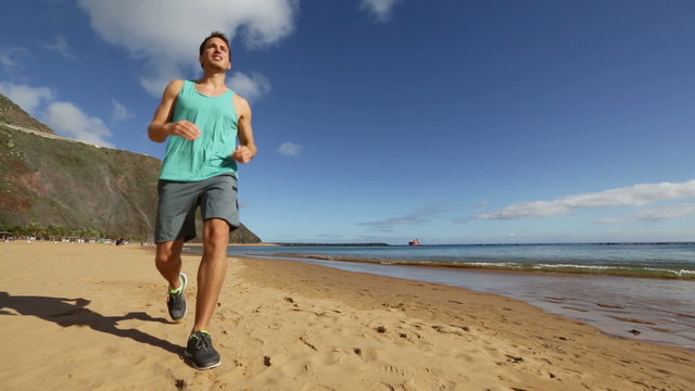 Sport man running on beach stopping sweating and starting jooging. Fit exercising male fitness athlete model working out on beautiful beach training for marathon run.