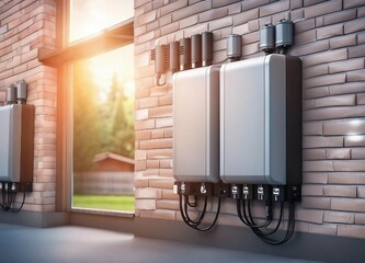 Outdoor home battery packs alternative electric energy storage system, garage wall background