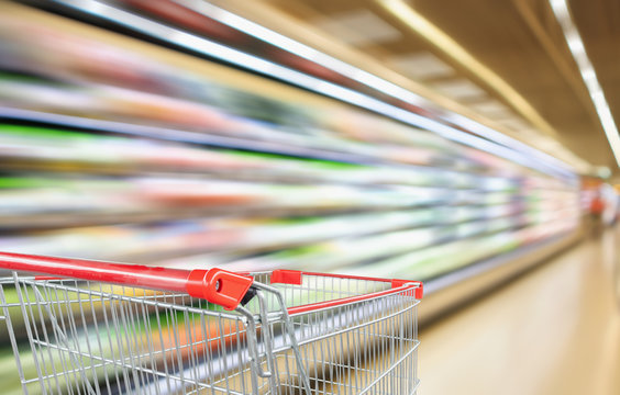 supermarket grocery store with fruit and vegetable shelves interior defocused background with empty red shopping cart