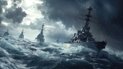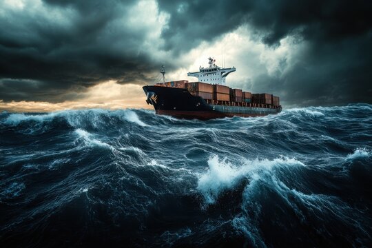 Cargo ship braving turbulent waters amidst stormy skies ocean voyage dramatic seascape nature's fury perspective of maritime adventure
