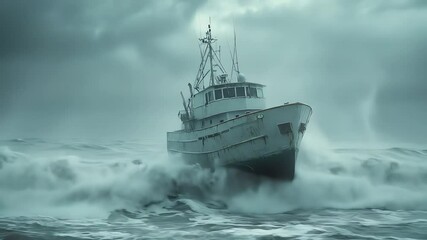 Fishing trawler bravely faces rough sea under stormy overcast sky
