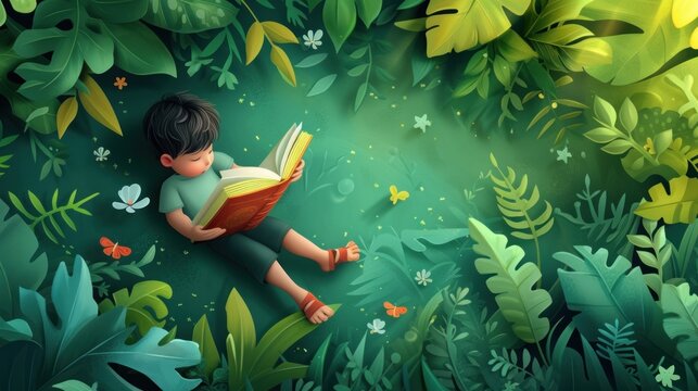 kid lying on green ground, reading a story from a book, wallpapers, children's books
