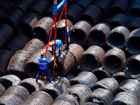 Top view of wire rods in coils stowage into cargo hold of the vessel, Stevedore to prepare for discharging steel wire rod from cargo hold of the vessel.
