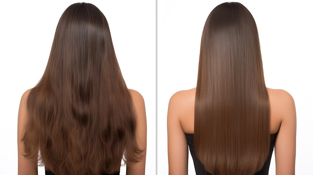 Woman before and after washing her hair with moisturizing shampoo on a white background. Flawless smooth hair after straightening with an iron. Collage, back view. Hair care and treatment concept