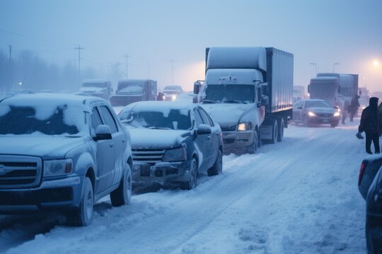 Anonymous men near stranded heavy trucks and cars with headlights on highway in snowing conditions