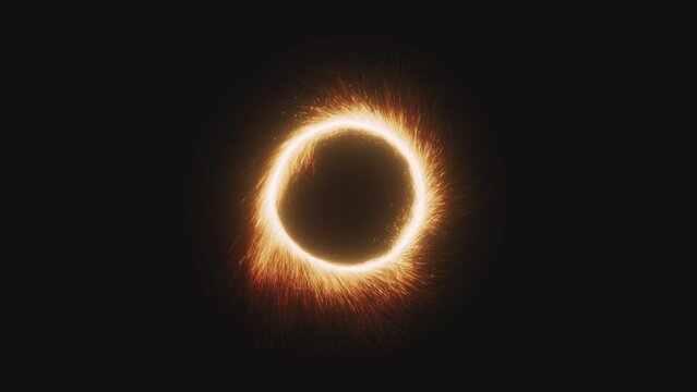 Magic fire portal, realistic teleport tunnel with smoke and sparkles, futuristic glowing golden neon rings. Vector illustration.
