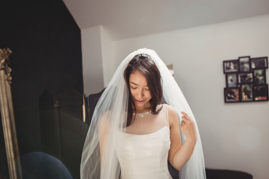Asian bride standing in bridal dressing room holding tulle veil at shoulder wearing wedding gown
