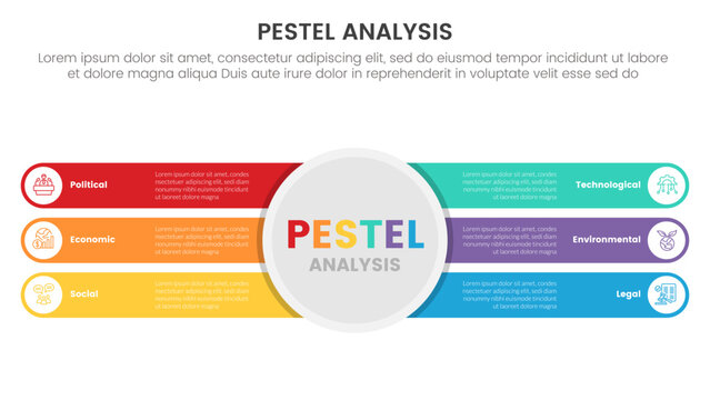 pestel business analysis tool framework infographic with big circle center and round rectangle with 6 point stages concept for slide presentation
