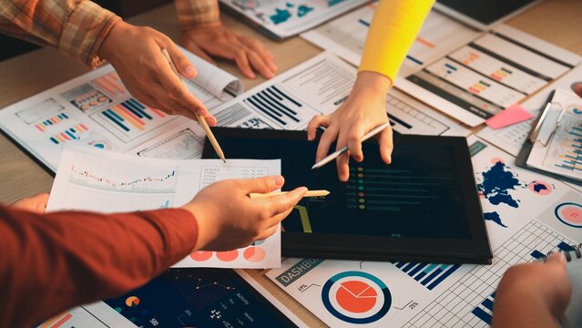 Engaging business meeting scene featuring hands analyzing data on a tablet alongside colorful charts and documents, showcasing collaboration and strategic planning efforts. SACTR