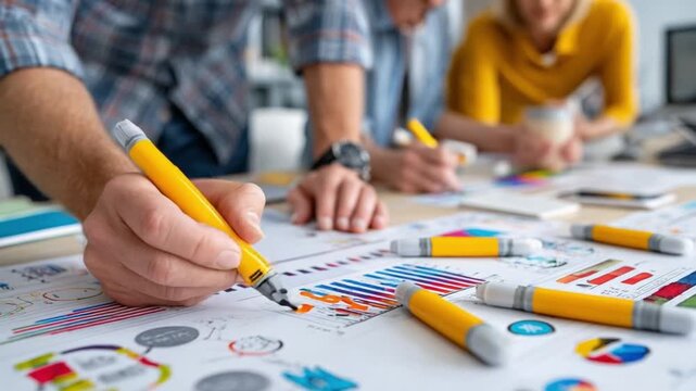 Team Collaboration & Analysis: Close-up of hands highlighting charts, illustrating team collaboration