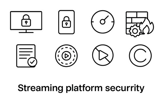 Streaming Security Icons. Outline icon set of streaming platform security: smart TV lock, secure mobile app,