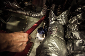 Engineer checking the flow of pure crude oil on a container ship at sea