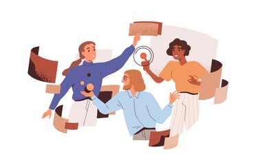 Team work at abstract project in technology space. Business process automation concept. People interact with cyberspace during teamwork. Flat graphic vector illustration isolated on white background