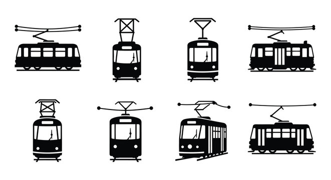 Tram and streetcar silhouette set with modern and vintage urban rail vehicles in front view for city transport design