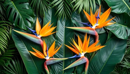 Vibrant orange bird of paradise flowers arranged amongst lush, dark green tropical foliage