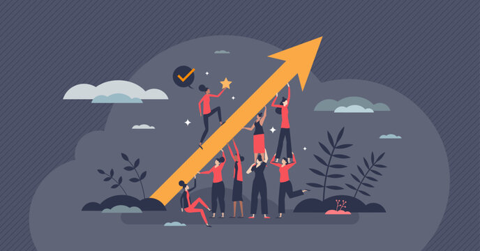 Woman empowerment and female feminism movement group tiny person concept. Strong and powerful social group with strength to fight and be proud of herself vector illustration. Achievement and success.