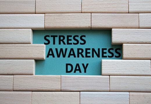 Stress Awareness Day symbol. Wooden blocks with words Stress Awareness Day. Beautiful grey green background. Business and Stress Awareness Day concept. Copy space.