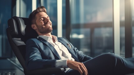 Asian businesswoman smiling, relaxing in modern office with hands behind head, laptop on desk. Bright workspace enhances productivity, focus, professional work environment, positivity.