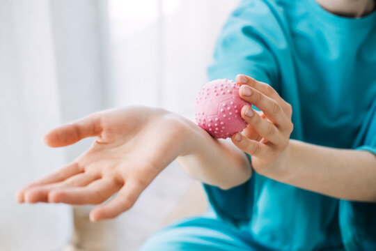 Close-up of woman applying a pink massage ball to her forearm. Tactile wellness, sensory therapy, mindful touch, daily stress relief