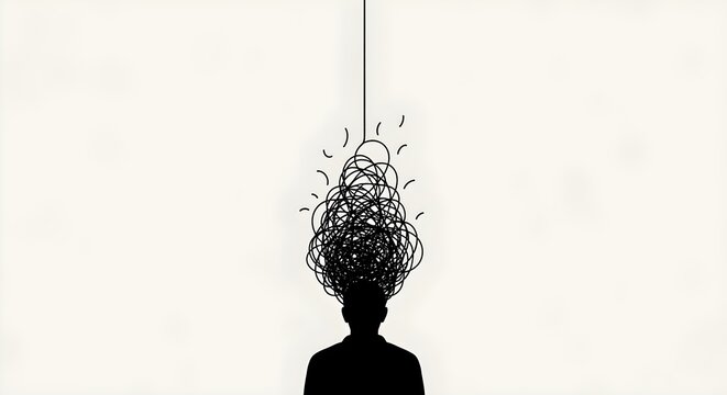 Minimal illustration: tangled black scribbles above person's head turning into clear straight line, stress relief concept