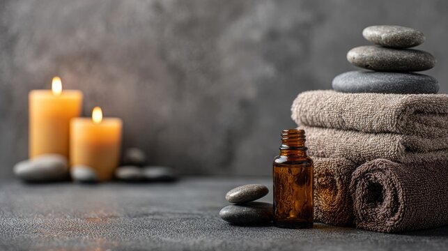 Relaxation Space With Essential Oils, Candles, Towels, and Stones on a Clean Surface Designed for Beauty Brand Solutions or Spa Promotions