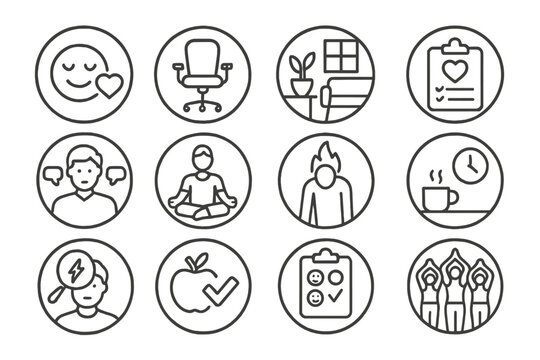 Workplace Wellbeing Icons. Line style round icons of workplace wellbeing: mental health day, ergonomic chair, calm space, wellness