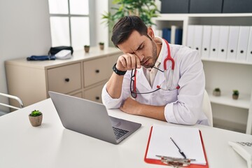 Overworked doctor working with laptop computer in hospital clinic. Male practitioner feeling stressed and tried during hard working time in medical centre. Focus on table clock.