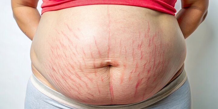 Pregnancy belly, stretch marks. Self love, body positive Motherhood. Preparation for childbirth. Vector illustration. For advertising, medical publications, for medicinal products, creams
