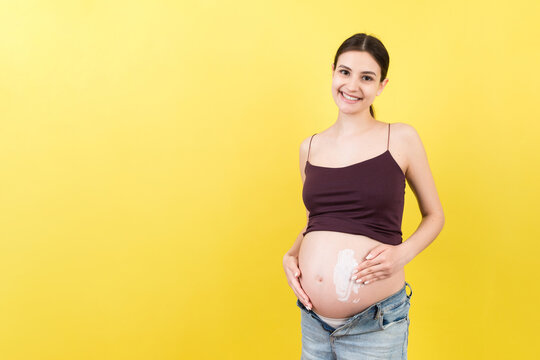 Close up of pregnant woman in opened jeans applying skin care cream on her belly to prevent stretch marks at colorful background with copy space. Healthy skin concept
