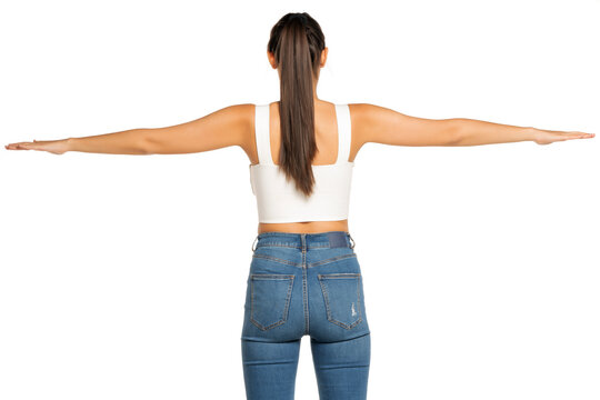 rear view of a young beautiful woman with outstretched arms and ponytail