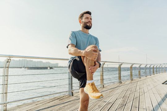 Man in athletic gear doing knee stretches on a sunny boardwalk by the sea.