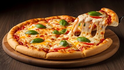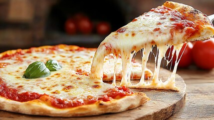 "Cheese pull pizza slice with stretchy melted mozzarella, golden crust, table serving background, warm Italian hot pizza shot.