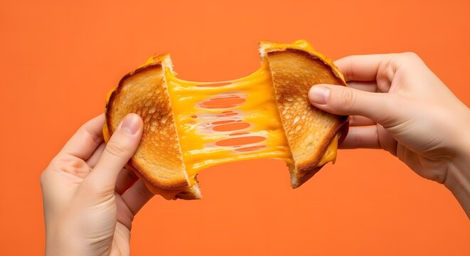Hands pulling apart a grilled cheese sandwich with stretchy melted cheese against an orange background, showcasing its gooey texture.
