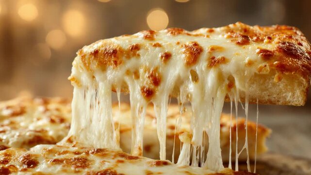 Golden Brown Baked Cheese Pizza Slice with Long Stretchy Melted Mozzarella Cheese Pull Against a Soft Bokeh Background