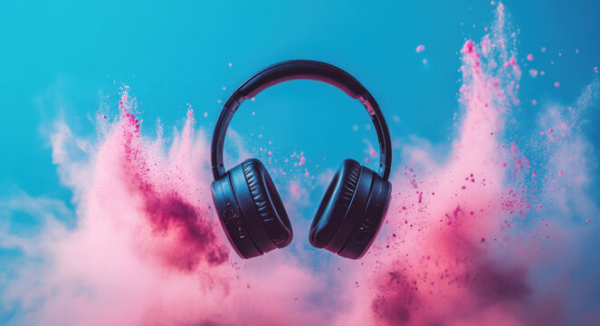 Black headphones are suspended in mid-air, surrounded by a burst of colorful dust, creating a striking visual against a blue backdrop