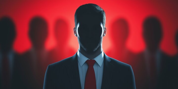A mysterious silhouette of an evil business man in a suit, highlighted by dramatic red lighting, evokes intrigue and suspense.