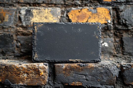 A dark gray rectangular sign rests on a rustic, aged brick wall. The contrast between the smooth sign and the rough texture of the bricks creates a striking visual effect.