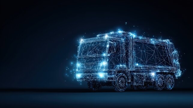 An artistic, futuristic digital representation of a refuse truck rendered in striking blue light. ..Created with Generative AI, not depicting real subjects.