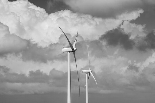 A striking black and white image featuring two wind turbines standing tall in an open field, emphasizing renewable energy and the contrast of technology against natural elements.