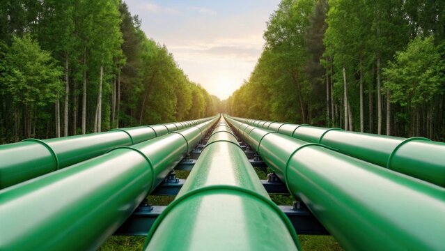 A long line of green pipes stretches through a lush forest, creating a striking contrast between nature and industrial infrastructure.
