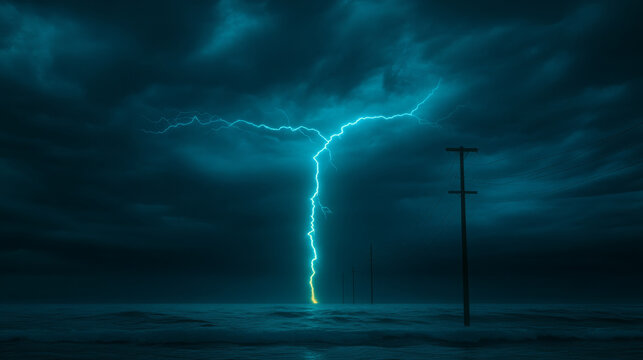 Lightning striking ocean water at night with dramatic clouds and power poles in distance