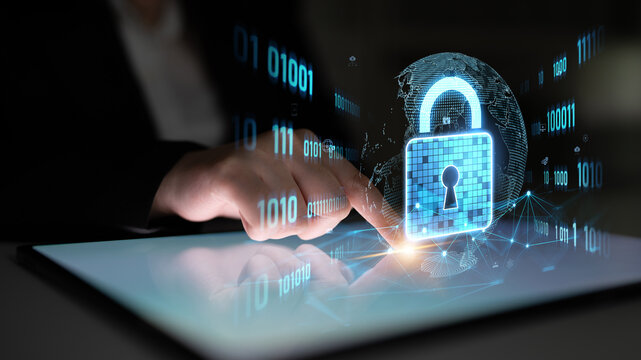 Cybersecurity technology for protecting data and privacy on mobile devices. Secure access, encryption, password protection, and digital identity verification with smart security interface.