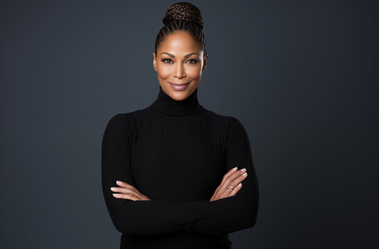 Confident woman in black turtleneck with braided hair, arms folded, posing against dark background, professional and strong