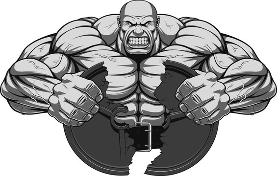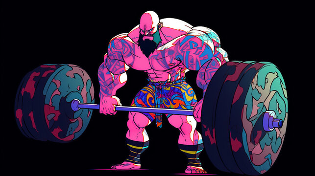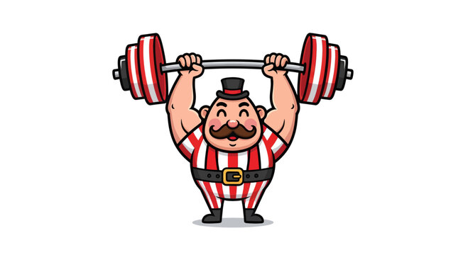 Cartoon circus strongman lifts a barbell with ease and showcases his power and strength
