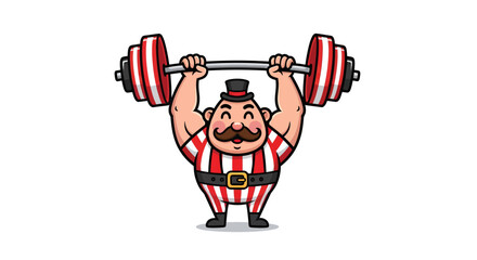 Cartoon circus strongman shapito character, sporting a retro-style handlebar mustache and striped one-piece, grins as he effortlessly lifts a giant barbells above his head with old-time funfair flair